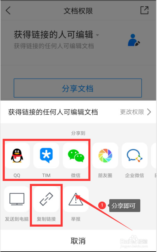 若是是只需要他人不雅看,可以选择【所有获得链接的人可查看】
