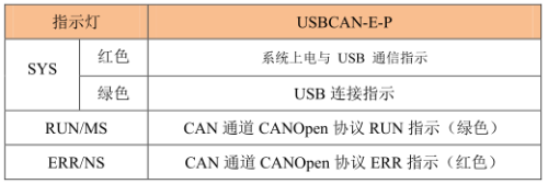 在USBCAN-E-P本家儿站卡上有三个双色LED指示灯,用于别离指示系统的运行状况和和谈运行状况,如下表格所示。