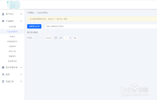 进入亥著开辟者中间,点击左侧导航栏的【产物概览】-【企业证书签名】