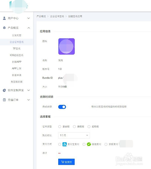上传本身的ipa文件,输入信息,选择合适的套餐,进行签名即可。