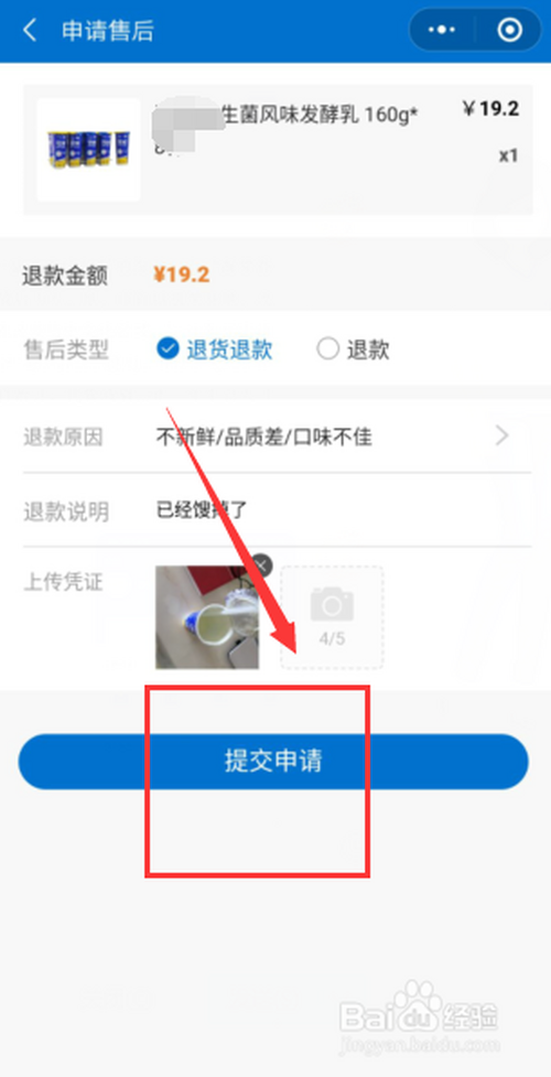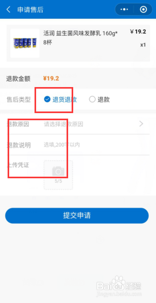 4、选择售后办事的形式,填写原因和恰当上传图片。