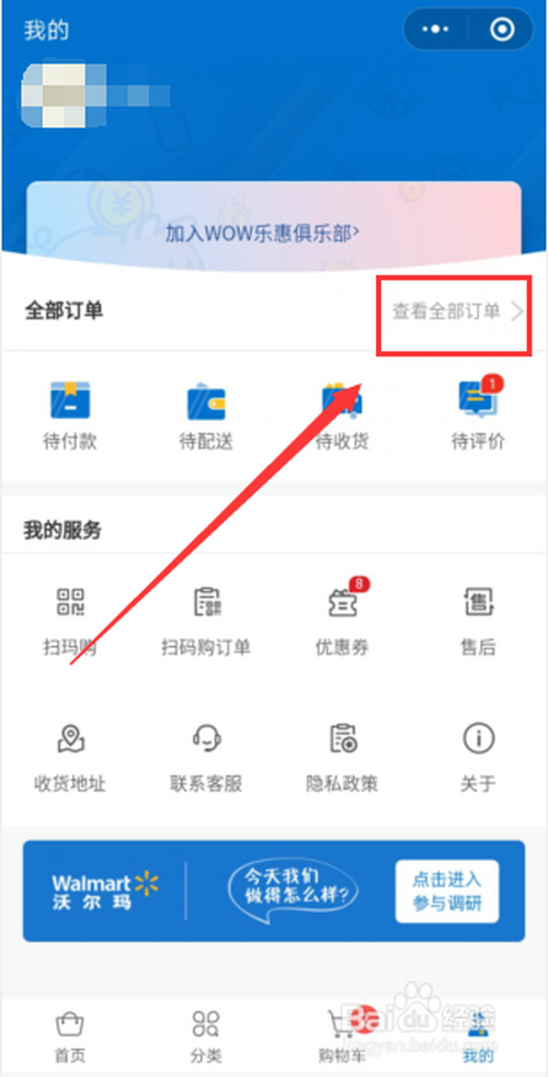打开微信小程序中的沃尔玛小程序,在我的界面点击全数订单。