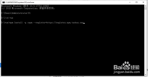 在cmd中输入:npm install -g cnpm --registry=https://registry.npm.taobao.org,输入后按回车。