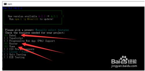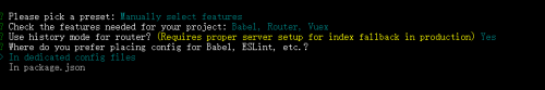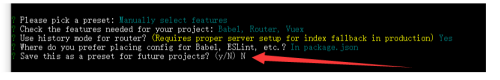 利用空格选中或反选 ,小我利用只需勾选 Babel Router和Vuex 选择后回车进入下一步。