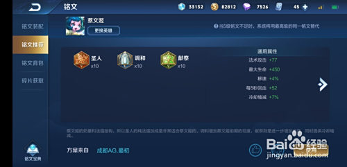 铭文搭配,圣人*10、和谐*10、献祭*10,增添法攻、生命值、移速、回血和冷却缩减。