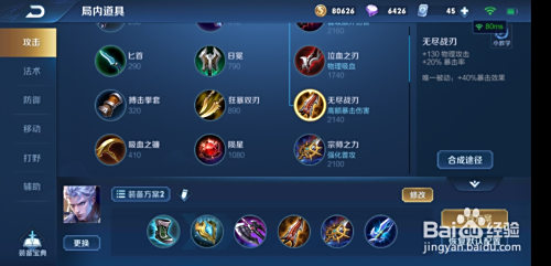 装备五,宗师之力,增添物理进犯、暴击、法力、血量。一刀流必备。