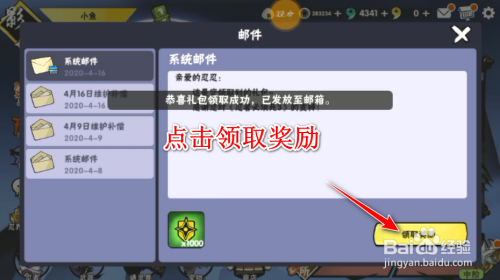 我们点击打开收件箱,查看最新邮件,可以领取到本周礼包是:1000个竞技币。