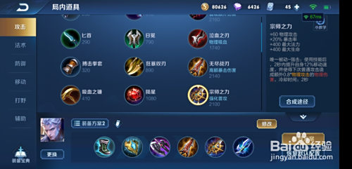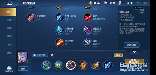 第三件装备,暗影战斧,增添物攻、血量、物理穿透。凯皇焦点装备之一。