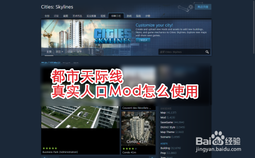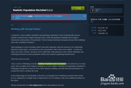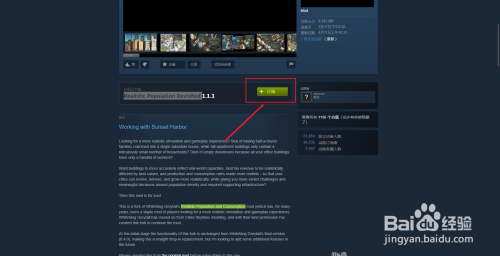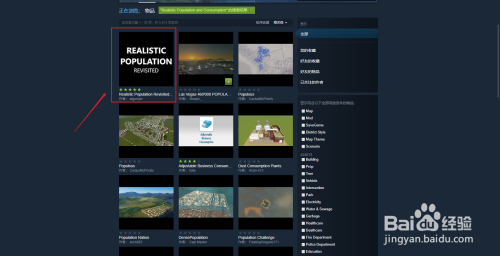 若是我们是正版用户(这个游戏本体也不贵,但愿大师撑持正版),那么我们需要打开我们的steam客户端,打开《都会:天际线(Cities: Skylines)》游戏的创意工坊,然后搜刮Realistic Population Revisited Mod,直接订阅即可。