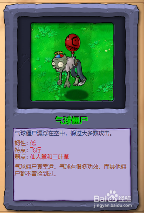 气球僵尸在空中走,能遁藏地面进犯。可是不克不及遁藏【仙人掌】的进犯。