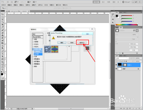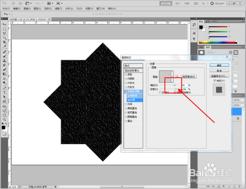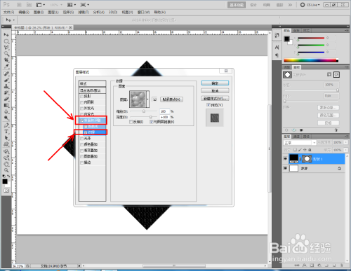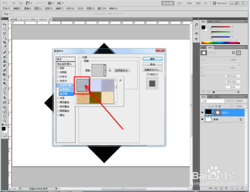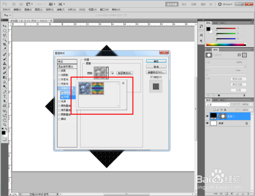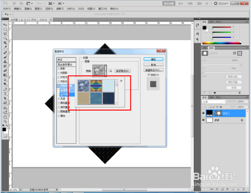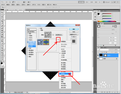 双击图示自界说图案图层,弹出图层样式设置栏。勾选【斜面和浮雕】-【纹理】,点击图示小三角,弹出图案选项栏;