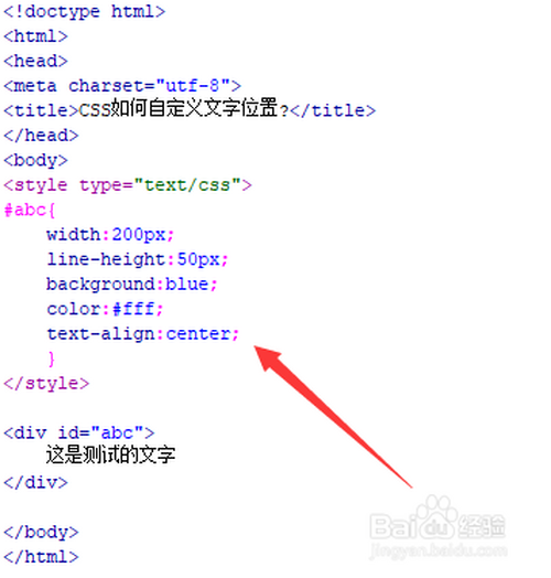 在css标签内,再利用text-align属性来界说文字的位置,例如,这里设置文字居中显示,即text-align为center。