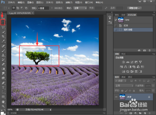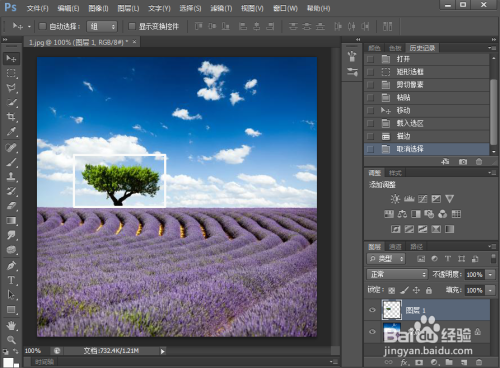 点击矩形选框东西,在树的四周画一个矩形选框;