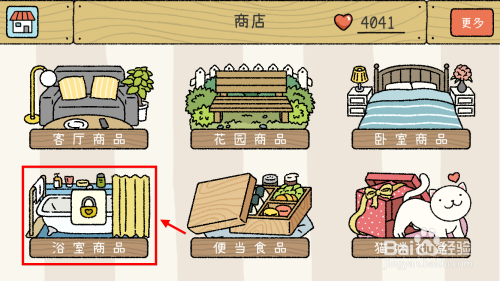4、从“商铺”选项进入后选择“浴室用品”,同样可以对浴室进行解锁。