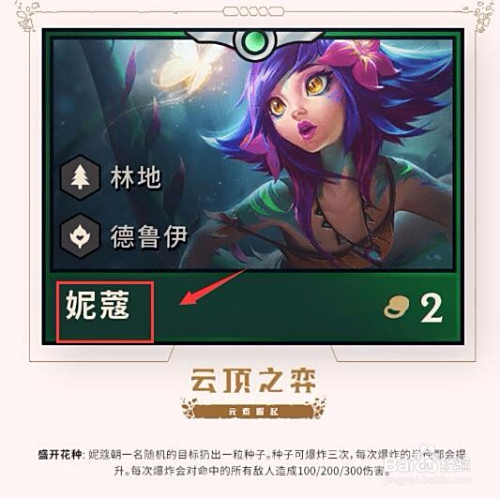 另一个丛林的英雄是可爱的妮蔻,技术是扔出一个会爆炸三次的种子,对敌方造当作大量的规模危险,前期可以作为步队里的本家儿要输出。