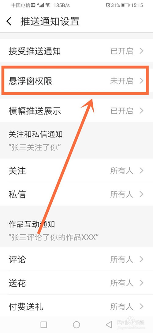 进入推送设置界面后,点击【悬浮窗权限】进入。如下图所示