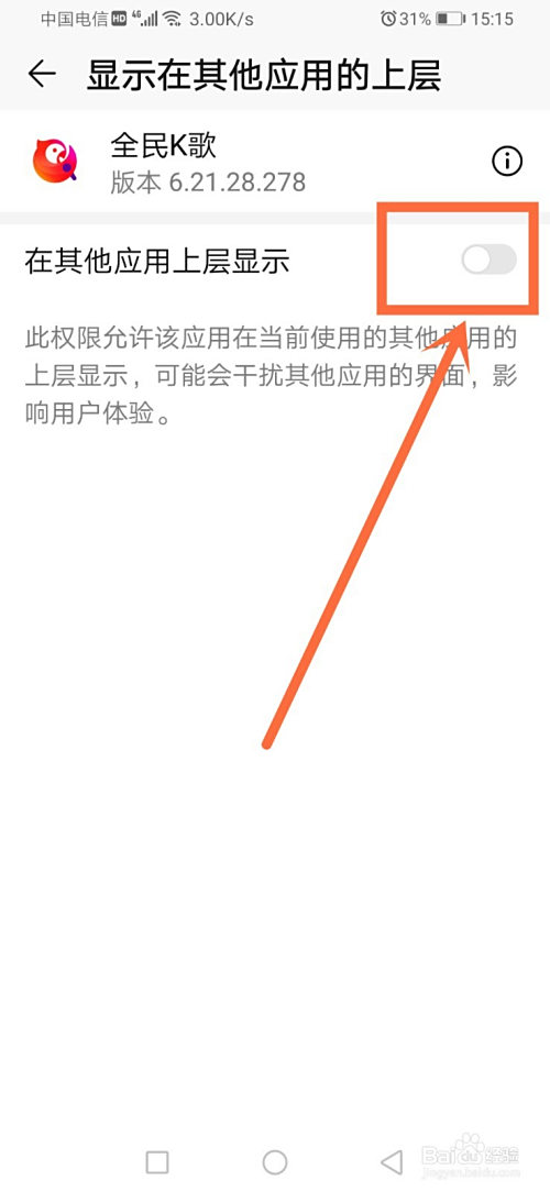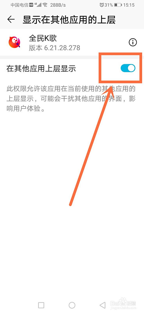 最后,看到按钮显示为蓝色的开启按钮即可,这样全平易近K歌的悬浮窗就当作功的开启了。如下图所示