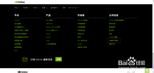 起首,我们打开NVIDIA的官网,将页面拖动到底部,找到“注册电子邮件”。