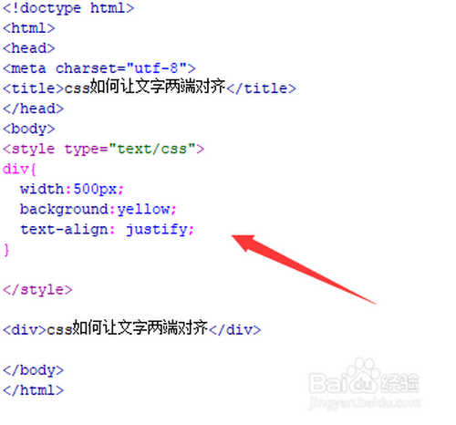 在css标签内,经由过程div元素名称设置div的样式,界说div的宽度为500px,布景颜色为黄色,同时将text-align属性设置为justify。