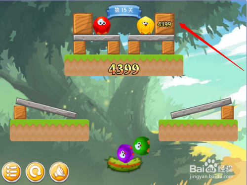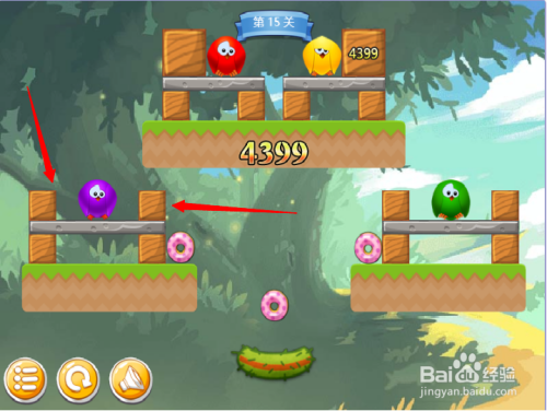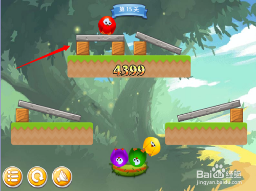 第四步:按照红色箭头,消弭木块,紫色小鸟回巢。