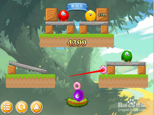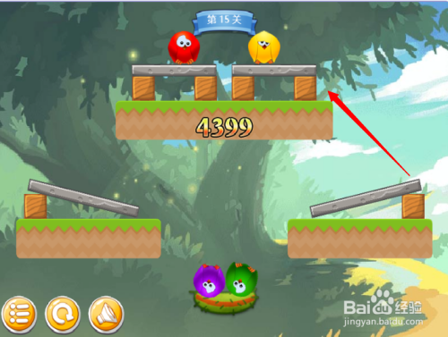 第五步:按照红色箭头,将木块断根,绿色小鸟回巢。