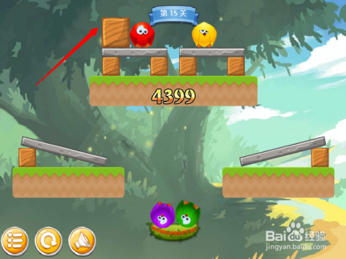 第七步:按照红色箭头,将木块断根,黄色小鸟回巢。