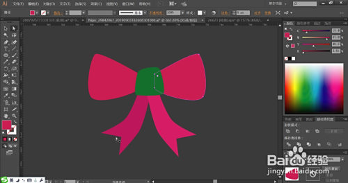 利用玫红色填充蝴蝶结的摆布两侧,再用品红色填充蝴蝶结的下方,蝴蝶结的中心用绿色填充。