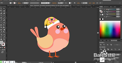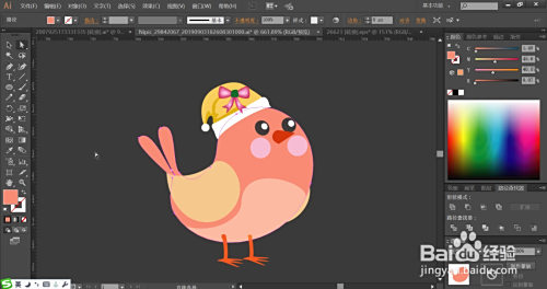 小胖鸟的帽子用土黄色填充,边缘的暗光用黄褐色填充,小胖鸟的嘴巴用桔红色填充再用网格东西点击做出渐变色的结果,小胖鸟的脸晕用桃红色填充,完当作小胖鸟图片设计。