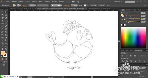 利用钢笔画出小胖鸟的根基身体轮廓,重点绘制小胖鸟的同党,双腿与从头至尾巴,还有头上的眼晴与尖嘴的细节路径,重点绘制头上的帽子与蝴蝶结的细节路径。