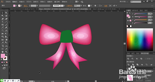 利用网格东西点击蝴蝶结的摆布侧让其呈现粉红色的渐变结果,再用网格东西点击一下蝴蝶结下方的飘带让其呈现渐变色。蝴蝶结的概况用滤色模式的半透明的白色来增强高光结果。