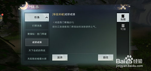 接下来我们再次点开使命栏,找到戒骄戒躁这个使命点击前去。便会主动寻路前去找到一个叫做西门寒鸦的NPC。接下来我们与他进行战斗,将其击败。