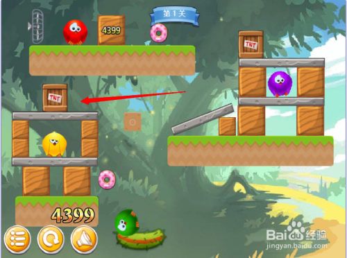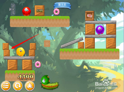 第四步:按照红色箭头,断根黄色小鸟上方障碍。