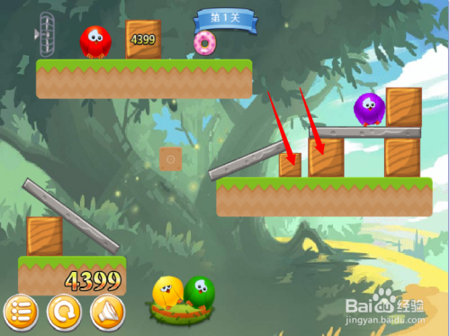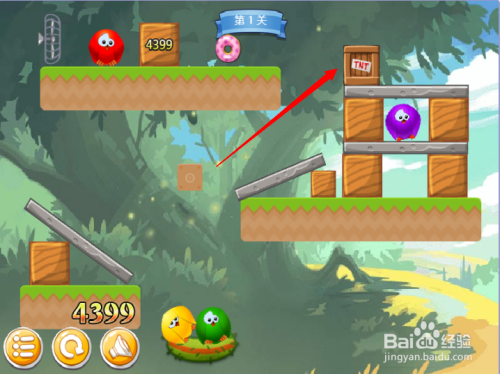 第七步:按照红色箭头,断根紫色小鸟和红色小鸟处木块。