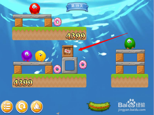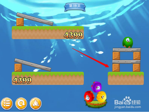 第四步:按照红色箭头,断根绿色小鸟左方障碍。
