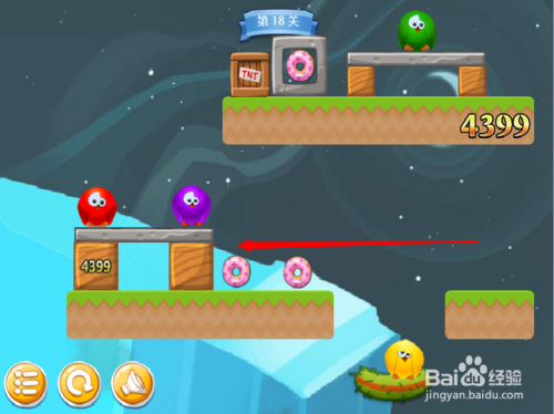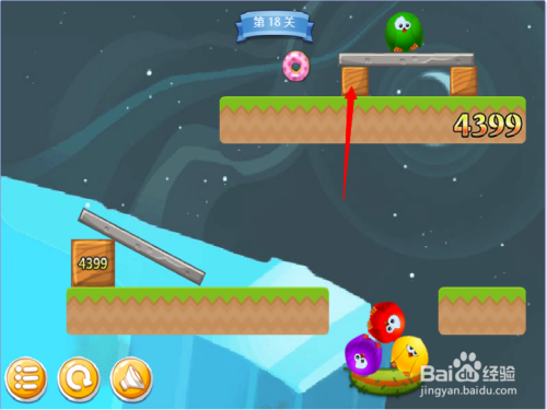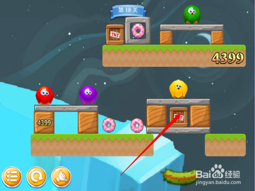 第五步:按照红色箭头,断根绿色小鸟处障碍。
