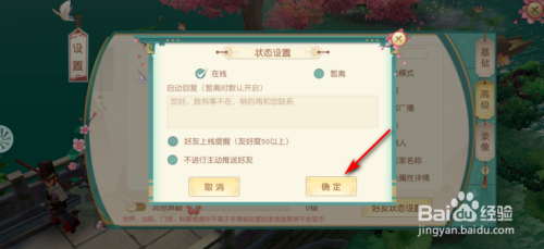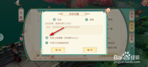 此时会弹出【状况设置】对话框,接着打消到老友上线提醒前面的【√】。