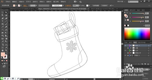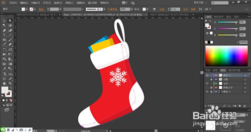 利用钢笔画出袜子的根基轮廓,再描画出袜子正面的雪花,再用钢笔画出袜子顶端里面的三个礼品盒的外形路径。
