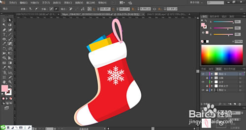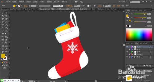 利用明暗黄色、绿色、红色别离填充袜子里面的盒子的分歧侧面,再用桃红色填充袜子上面的吊绳,复制袜子的路径再放到最底层别离填充浅红色与白色作为左侧的高光结果,完当作袜子图片设计。
