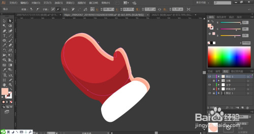 利用红色与暗红色搭配填充袜子的本家儿体路径与暗光,再用白色填充袜子的顶端、左侧与右侧的布局件。