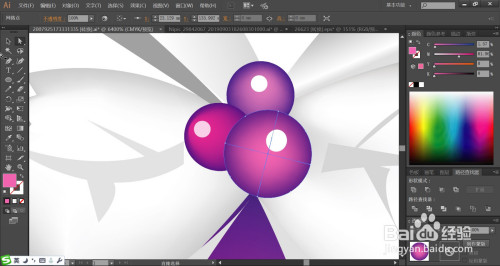 利用紫红色填充右侧球体顶端的花蕊圆形,再用网格东西做出紫红色的渐变结果,高光圆点用白色填充。