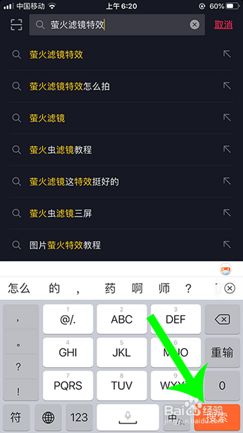 在搜刮框输入“萤火滤镜特效”,再点击“搜刮”。