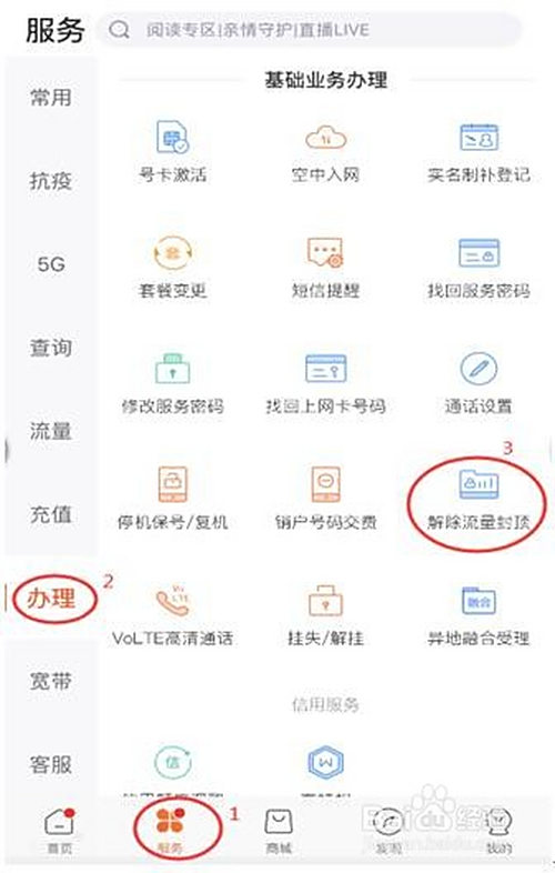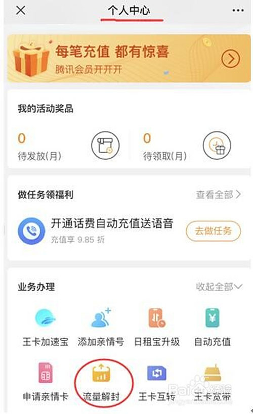 点击“办事-打点-解除流量封顶”;