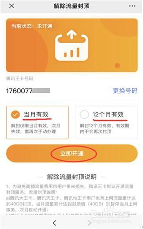 点击“当月有用”或“12个月有用”,再点击“当即开通”按钮即可完当作。
