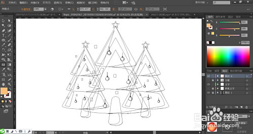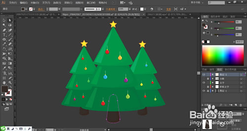 再用钢笔画出圣诞树的根基路径,再用钢笔画出大树的左侧亮光与右侧的暗光,画出树上的良多的圆形礼品球的细节路径,再画出树顶的星星路径,下方的树干的路径细节。