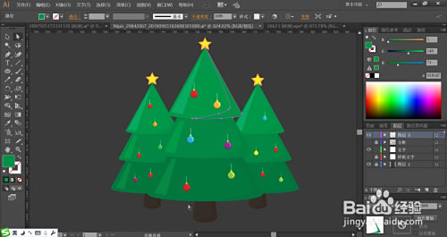 利用绿色填充圣诞树的本家儿体,再用淡绿色填充左侧的亮光路径,用暗绿色填充右侧的暗光路径。