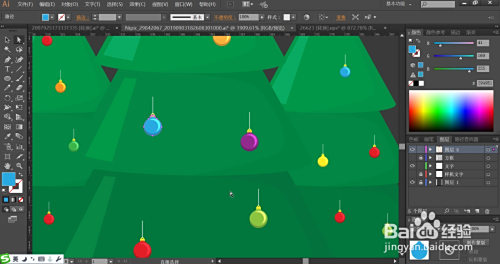 接着,我们用蓝、紫、绿、橙、红别离填充树上的一个个分歧的小球形,并在上面经由过程相似色做出亮光与暗光在边缘。礼品球的上方用白色与黄色搭配填充吊绳与吊坠的布局件,完当作圣诞树图片设计。