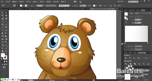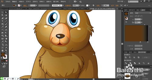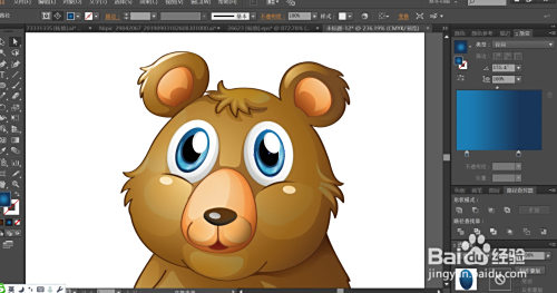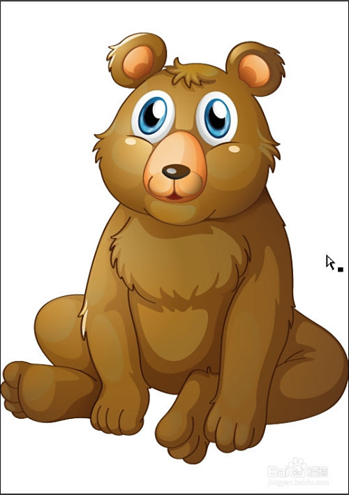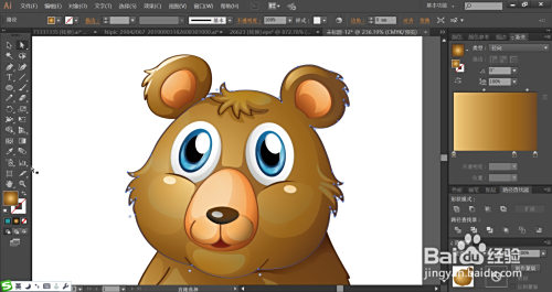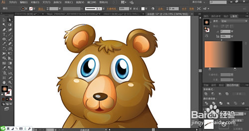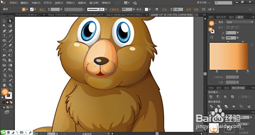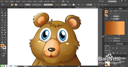 笨熊的眼晴用蓝色的渐变与灰白色的渐变搭配填充,在眼白与瞳孔上面做出高光与暗光的结果。笨熊的鼻子与嘴巴用桔红色渐变与咖啡色渐变、暗红色渐变搭配填充。