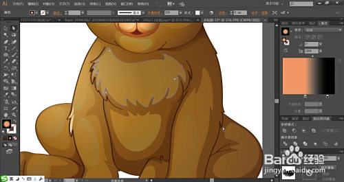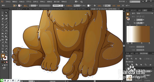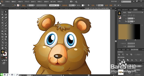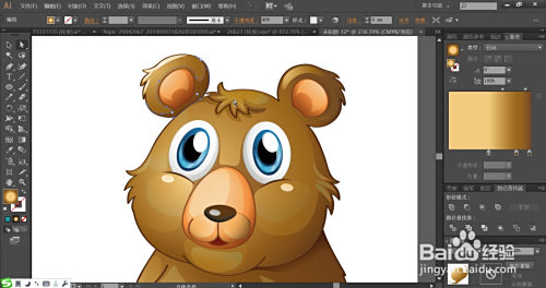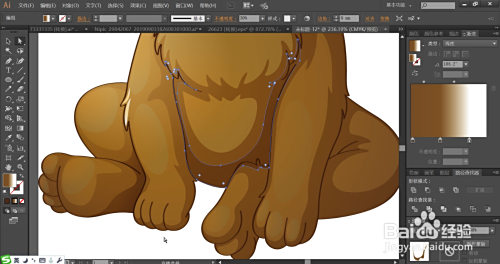 笨熊的身体边缘的暗光与中心的过渡条理的路径用黄棕色到白色的渐变填充,设置色彩模式为正片叠底,设置透明度为20%摆布,完当作笨熊形象设计。