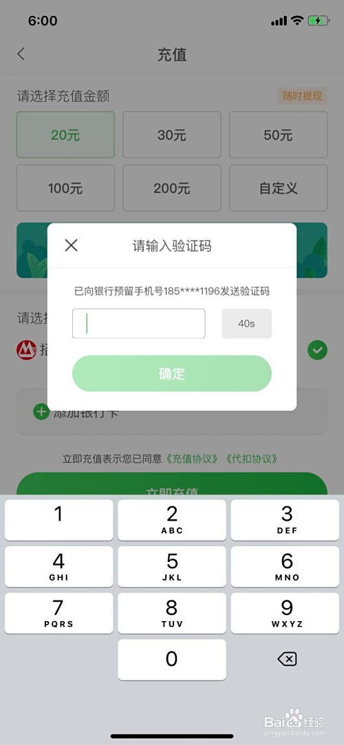 银行预留手机号会受到一条验证码短信,输入验证码后,点击“确定”