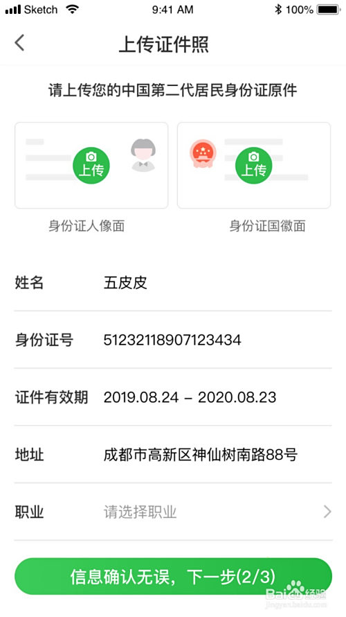 上传身份证照片后,系统主动识别信息。确认无误后,选择“职业”,点击下一步。